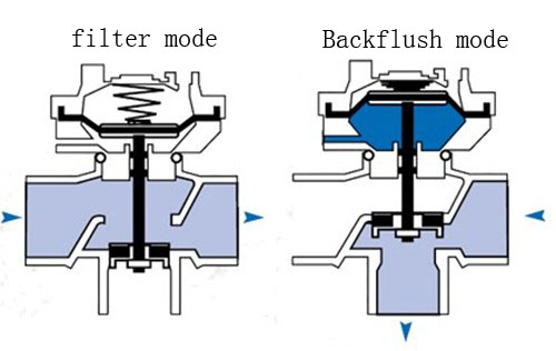 When hydraulic signal sent by controller is received, backflush valve shall change flow direction: shut down inlet, open outlet, clean water filtered by other filter unit enters this unit to flush, then flushed water is exhausted by drain outlet.