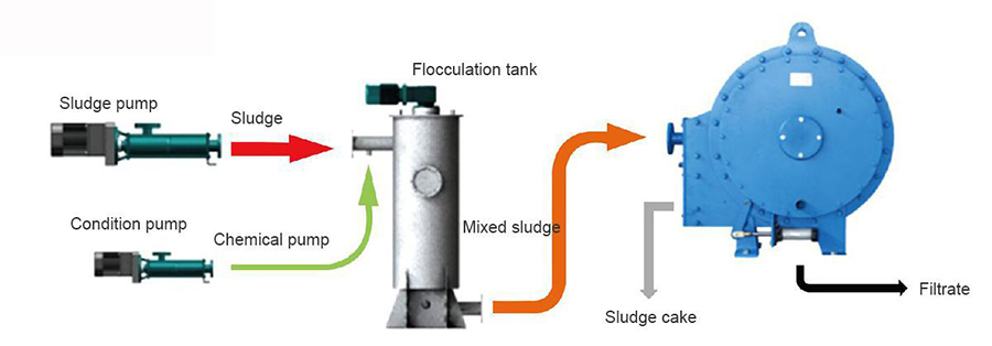 Conditioned sewage containing sludge enters the sludge dewatering filter discs, which has an annular channel. Microporous filter plates are on either side of the disc channel, creating small holes when rotated by low speed. As a result, water is forced out of filter holes at the sides of the channel, which gradually shrinks in size. Inlet thrust and filter friction push the sludge towards the outlet, and the adjustable back pressure valve plate allows for additional water to be forced out. This fulfills the purpose of dehydration, and sludge is finally discharged from the valve plate opening.