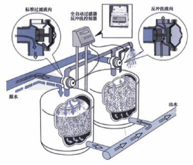 当系统处于反洗状态时,过滤仍然继续,其中要进行反洗的标准单元砂缸不进行过滤,系统中其它标准单元砂缸仍然在过滤。过滤后的清洁水部分用来反洗标准单元砂缸,其余仍送到用户处。反冲洗污水则通过水力阀的反洗排水口被排出。在高速砂缸全自动高效过滤系统中,特殊的集水器设计可使填料之间填料相互搓洗,较大限度地提高反冲洗效率,减少所需的反洗水(清洁水),同时反洗时没有跑料现象。一个标准单元砂缸反洗为2分钟,反冲洗结束,标准单元砂缸内部压头损失减小到合理范围,定压装置给出复原信号,水力阀恢复到过滤状态,下一个标准单元砂缸则准备进入反洗状态。
